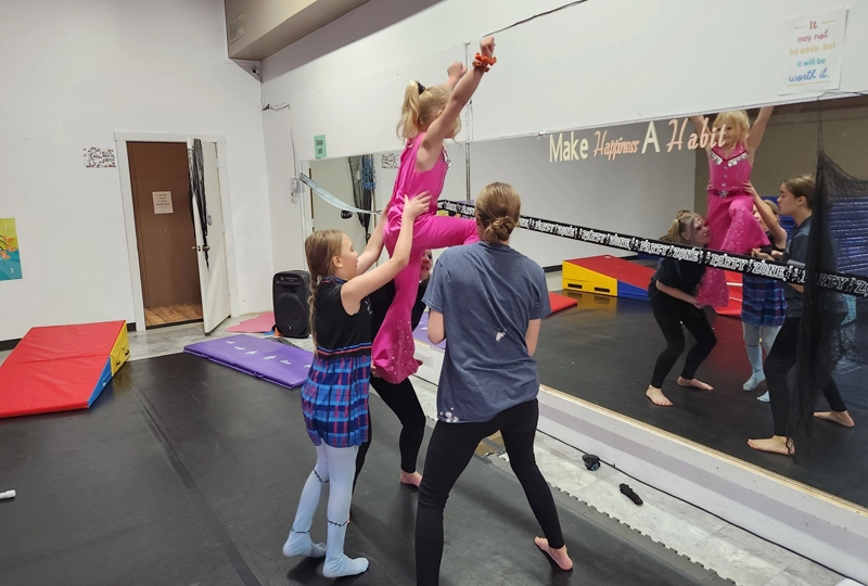 Safety underpins everything. We teach how to prepare joints, land, and reset after a miss without losing confidence. Beginner stunts are introduced only when readiness is clear, with defined roles for bases and flyers and spotting that follows studio protocol. Attire is fitted for visibility, clean sneakers are required, hair is secured, and jewelry is minimal.
